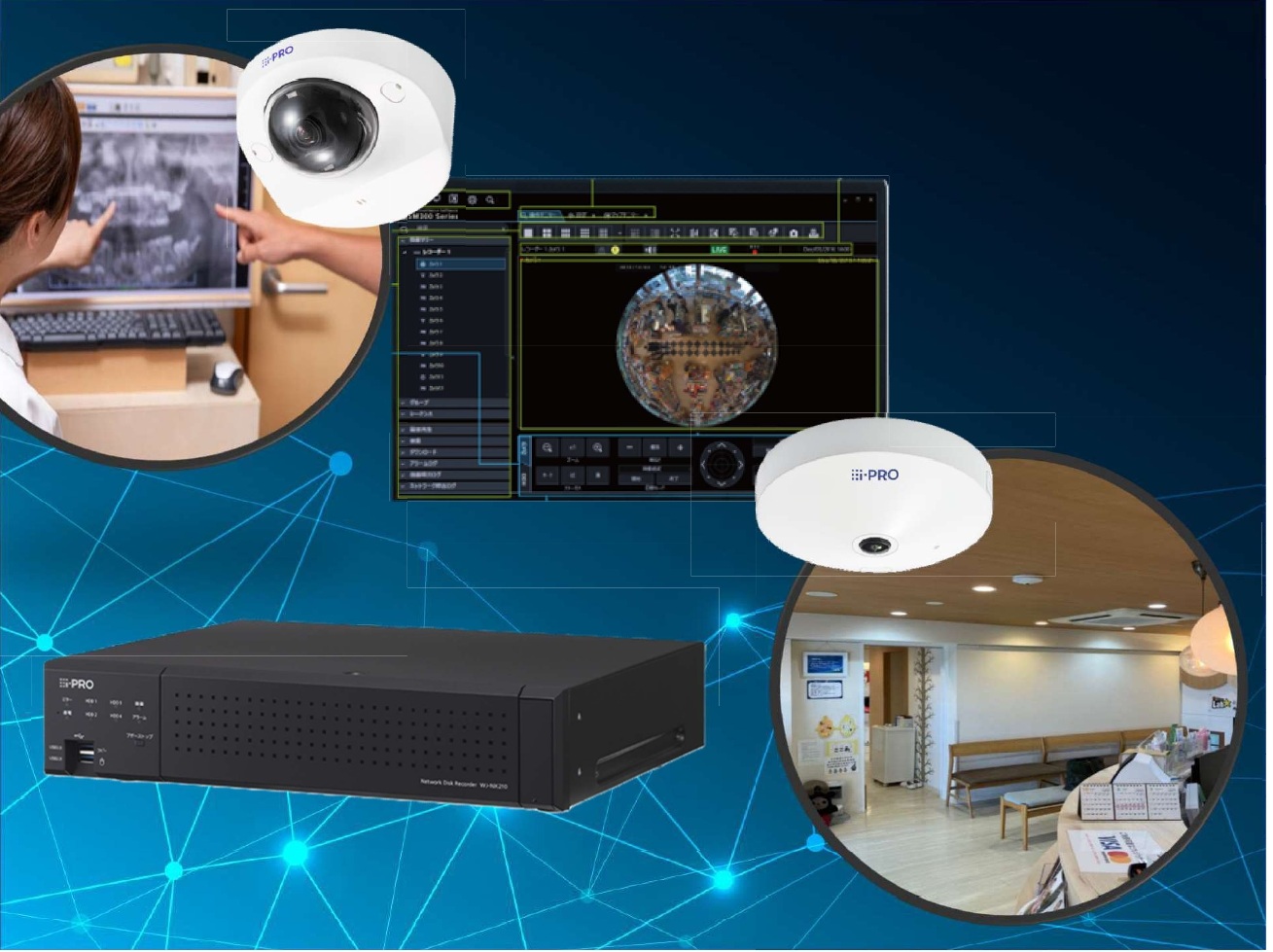 当院の希望としては、防犯カメラを各治療台へ設置し、映像・音声を録画録音しつつ、マンション1階のテナントをもう1ヶ所借りて作る予定の院長室で、院内をモニタリングできるようなシステムを構築していただきたいとお伝えしたところ、高性能魚眼レンズを搭載し360°全方位をクリアに撮影できる全方位カメラの導入をご提案され、また外出先でも院内の様子を把握できる外部デバイスによる遠隔監視を実施するためのクラウドサービス<みえますねっと>もご紹介いただき、こちらの希望と一致致しました。