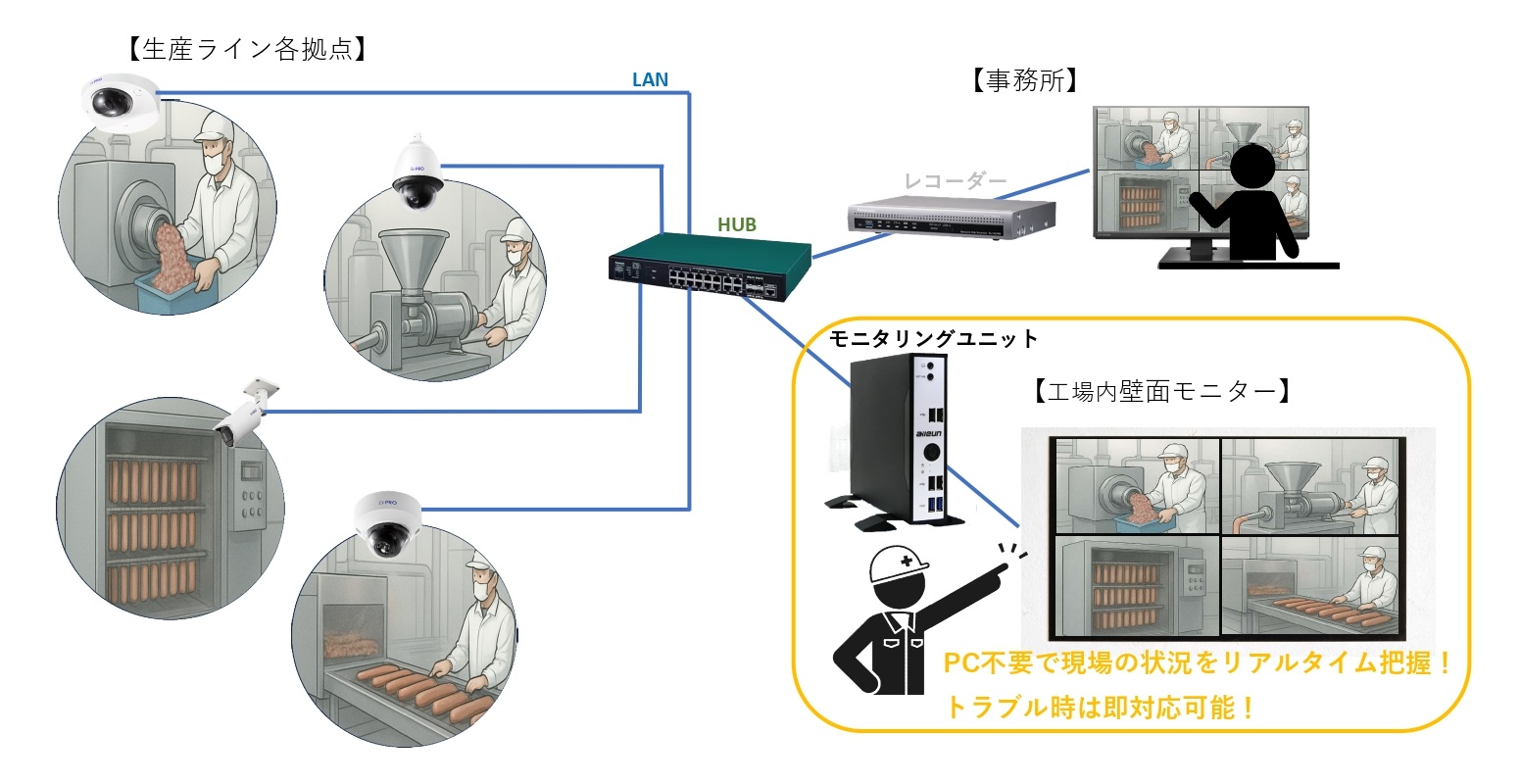 別フロアの事務所では、工場内の監視カメラ映像をライブ表示するシステムを導入済みですが、生産ライン上でもライブ映像を利用し、ライン管理を強化されたいとのご希望でした。
