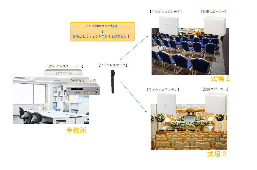 葬儀の規模により部屋を使い分ける関係で、部屋数分のワイヤレスマイク設備一式を準備し、使い分けておりましたが、各部屋にワイヤレスマイクアンテナがあることで、ワイヤレスマイク設備が1式で対応が可能になりました。どの部屋にいても同じマイクが使用可能で、アンプ側で放送エリアの変更をするだけで、準備が完了出来るようになりました。